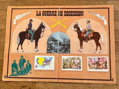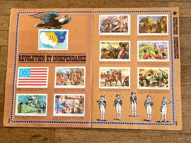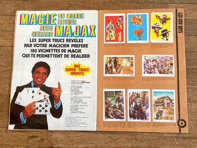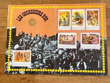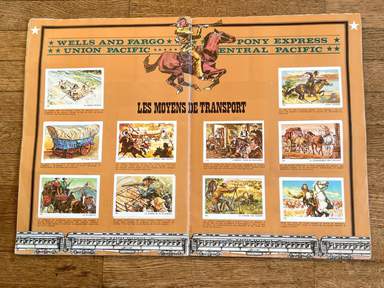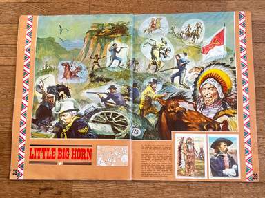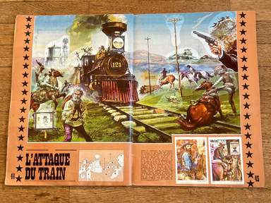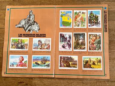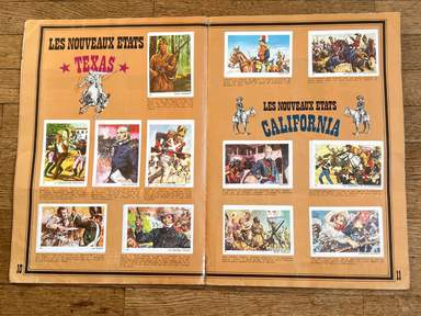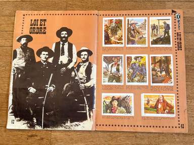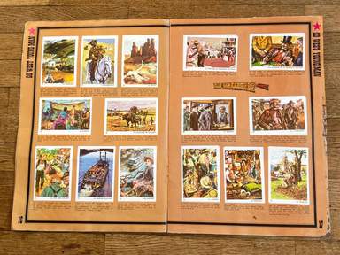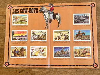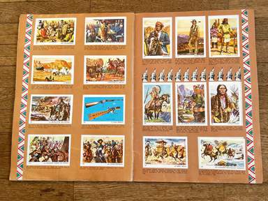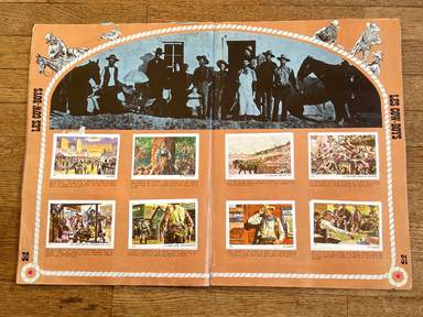 • ألبوم الملصقات، طبعة سوبر راف، من عام 1973، الأصلي الأبطال والأساطير في زمن الرواد. أقصى، كامل، 267 ملصقًا؛ منها 189 كلاسيكية و 78 على شكل. الصور الموجودة في المجموعة تصور الأبطال والأساطير في زمن رواد غرب الولايات المتحدة الأمريكية وتتتبع تاريخ الولايات المتحدة في بداية القرن التاسع عشر، مع نزوح المستوطنين نحو الغرب والاشتباكات الحتمية مع المحتلين السكان الطبيعيين لتلك الأراضي، وهم الهنود. يتتبع الألبوم التسلسل بشكل مثالي مع المواضيع التالية: أمريكا الهنود الحمر، القرية الهندية، المستوطنون الأوائل، الثورة والاستقلال، الولايات الجديدة، ألامو، التوجه غربًا، المنقبون عن الذهب، حرب الانفصال، جيتيسبيرغ ، رعاة البقر، المزرعة، النقل، الحروب الهندية، ليتل بيج هورن، القانون والنظام، هجوم القطار، مسابقات رعاة البقر. الألبوم بحالته العامة كما هو موضح في الصورة.