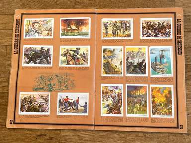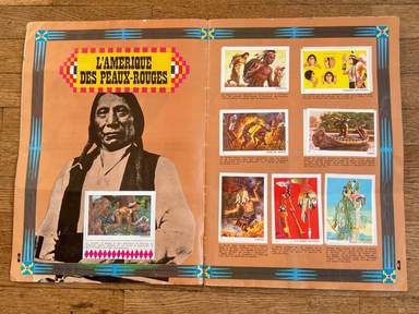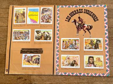 • Sticker album, Super Raf edition, from 1973, original. HEROES AND LEGENDS IN THE TIMES OF THE PIONEERS. FARWEST, COMPLETE, 267 stickers; of which 189 classic and 78 shaped. The images in the collection depict the heroes and legends of the pioneers of the western United States of America and trace the history of the USA at the beginning of the 19th century, with the exodus of settlers towards the west and the inevitable clashes with the natural occupants of those territories, the Indians. The album perfectly traces the sequence with the following topics: The America of the Redskins, the Indian village, the first settlers, revolution and independence, the new states, the Alamo, go west, the gold diggers, the war of secession, Gettysburg, the cowboys, the ranch, means of transport, the Indian wars, Little Big Horn, law and order, train attack, the rodeo. Album in general condition, as per photo.