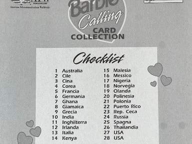 • Άλμπουμ καρτών, έκδοση Panini, πρωτότυπο του 1988, BARBIE, ATW CALLING CARD COLLECTION, COMPLETE, 28 αυτοκόλλητα. Οι εικόνες της συλλογής, παραγωγής Panini Modena, σε συνεργασία με την ATW, απεικονίζουν τον κόσμο της πιο διάσημης κούκλας στον κόσμο, ντυμένη με το τυπικό φόρεμα ορισμένων εθνών: Αυστραλία, Χιλή, Κίνα, Κορέα, Γαλλία, Γερμανία, Γκάνα. , Τζαμάικα, Ελλάδα, Ινδία, Αγγλία, Ιρλανδία, Ιταλία, Κένυα, Μαλαισία, Μεξικό, Νιγηρία, Νορβηγία, Ολλανδία, Πολυνησία, Πολωνία, Πουέρτο Ρίκο, Τσεχική Δημοκρατία, Ρωσία, Ισπανία, Ταϊλάνδη, Ηνωμένες Πολιτείες Αμερικής. Το άλμπουμ σε γενική κατάσταση από φωτογραφία