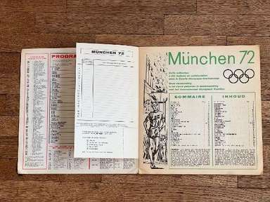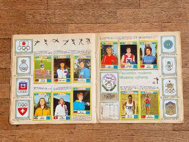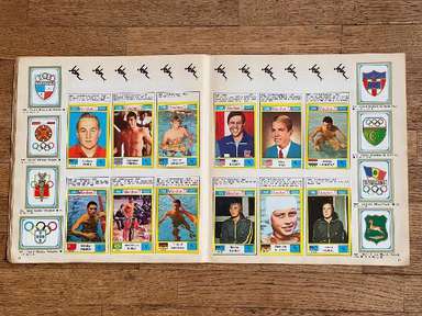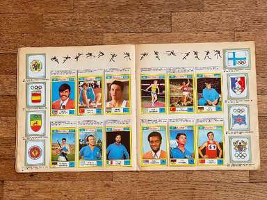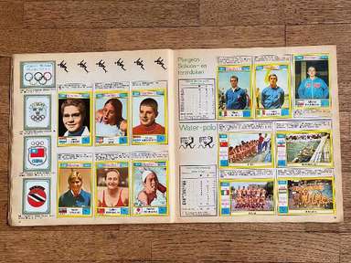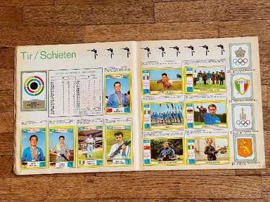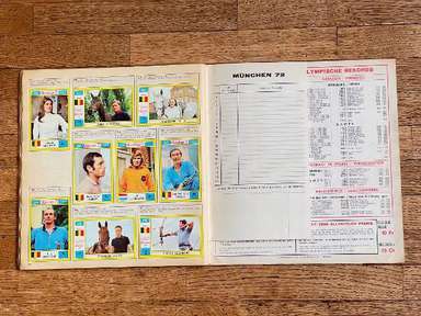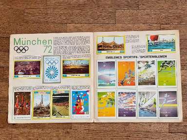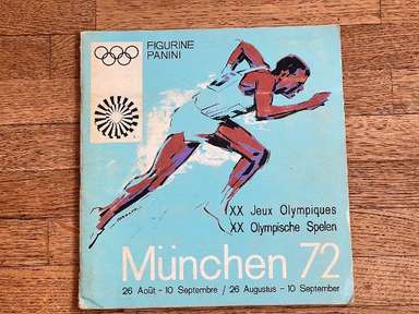 Λεύκωμα με αυτοκόλλητα, έκδοση Panini, πρωτότυπο του 1972, Μονακό, πλήρες, 270 αυτοκόλλητα και 81 γραμματόσημα. Οι εικόνες της συλλογής απεικονίζουν τους πρωταγωνιστές αθλητές σε διάφορους κλάδους (Στίβος, Τοξοβολία, Μπάσκετ, Πυγμαχία, Κανό, Ποδηλασία, Καταδύσεις, Ιππασία, Ξιφασκία, Χόκεϊ επί χόρτου, Ποδόσφαιρο, Γυμναστική, Χάντμπολ, Τζούντο, Μοντέρνο Πένταθλο, Κωπηλασία, Ιστιοπλοΐα , Σκοποβολή, Κολύμβηση, Βόλεϊ, Υδατοσφαίριση, Άρση Βαρών, Πάλη) των Αγώνων της ΧΧ Ολυμπιάδας, που διεξήχθησαν στο Μόναχο της Δυτικής Γερμανίας, από τις 26 Αυγούστου έως τις 11 Σεπτεμβρίου 1972. Πολλά δείγματα στο άλμπουμ: Mark Spitz (ΗΠΑ, κολύμβηση) : συμμετέχει σε 7 αγώνες (100 και 200 μέτρα ελεύθερο, 100 και 200 μέτρα πεταλούδα, 4x100 και 4x200 σκυταλοδρομία ελεύθερου, 4x100 μικτή σκυταλοδρομία) σε μόλις 8 ημέρες, κερδίζοντας όλους και κάνοντας τόσα παγκόσμια ρεκόρ. Ο Ανατολικογερμανός Roland Matthes κερδίζει το 10 και 200 μ. ύπτιο για δεύτερη συνεχόμενη φορά. Ο δεκαεξάχρονος Αυστραλός Σέιν Γκουλντ κερδίζει 3 χρυσά μετάλλια (200 και 400 μ. ελεύθερο, 200 μ. μικτή), 1 ασημένιο και 1 χάλκινο. Η δεκαοκτάχρονη Novella Calligaris από την Πάντοβα, με ένα ασημένιο στα 400 μ. ελεύθερο και δύο χάλκινα στα 800 μ. ελεύθερο και στα 400 μ. μικτή, κέρδισε τα πρώτα Ολυμπιακά μετάλλια στην ιστορία της ιταλικής κολύμβησης. Η Βενετσιάνικη ξιφομάχος Antonella Ragno τελειώνει την καριέρα της στο Μονακό με χρυσό σε αλουμινόχαρτο. Ο δύτης Klaus Dibiasi επιβεβαιώνει το χρυσό που αποκτήθηκε στην προηγούμενη έκδοση των Αγώνων από την πλατφόρμα. Ο Σοβιετικός Valerij Borzov κερδίζει τα 100 και 200 m. Στα 200 μ. ο Ιταλός Πιέτρο Μενέα κατακτά, στην πρώτη του συμμετοχή σε Ολυμπιακούς Αγώνες, το χάλκινο μετάλλιο πίσω από τον Αμερικανό Λάρι Μπλακ. Στους αγώνες μεσαίας απόστασης οι Φινλανδοί κερδίζουν ξανά: ο Pekka Vasala κερδίζει τα 1.500 μέτρα, ο Lasse Virén στα 5.000 και τα 10.000 μέτρα. Ο Βιρέν θα επιβεβαιώσει τον εαυτό του και στις δύο αποστάσεις στους επόμενους Ολυμπιακούς Αγώνες. Ο Ουγκάντας John Akii-Bua κερδίζει τα 400 μέτρα με εμπόδια με παγκόσμιο ρεκόρ: είναι ο πρώτος Ουγκάντας που κέρδισε χρυσό Ολυμπιακό. Οι μαύροι Αμερικανοί Vince Matthews και Wayne Collett, χρυσό και ασήμι στα 400 μ. Οι Ιάπωνες εξακολουθούν να κυριαρχούν στη σκηνή στη γυμναστική των ανδρών: Ο Sawao Katō είναι ένας χρυσός μετάλλιος στο all-around και στο ομαδικό αγώνισμα και στις παράλληλες ράβδους. Η υποτιμητική Σοβιετική αθλήτρια Olga Korbut κερδίζει δύο χρυσά και ένα ασημένιο στο ατομικό όργανο. Ο Κουβανός πυγμάχος Teófilo Stevenson κερδίζει τον πρώτο από τους 3 διαδοχικούς Ολυμπιακούς τίτλους (1972, 1976. 1980). Ο Ολλανδός Βιμ Ρούσκα γίνεται ο πρώτος και μέχρι στιγμής μοναδικός τζούντοκα που κατακτά δύο τίτλους στην ίδια διοργάνωση, κερδίζοντας τόσο την κατηγορία των +93 κιλών όσο και την κατηγορία Open. Ο Γάλλος ποδηλάτης Daniel Morelon επαναλαμβάνει την επιτυχία της Πόλης του Μεξικού στην ταχύτητα. Το χόκεϊ επί χόρτου είδε το Πακιστάν, τον υπερασπιστή του πρωταθλητή, να νικιέται με 1-0 στον τελικό από τη Δυτική Γερμανία. Η Ulrike Meyfarth (Δυτική Γερμανία) στα 16 της καταφέρνει να νικήσει όλους τους αντιπάλους της στο άλμα εις ύψος. Στο τουρνουά μπάσκετ, οι ΗΠΑ είδαν το σερί 63 διαδοχικών νικών στους Ολυμπιακούς Αγώνες, που ξεκίνησαν το 1936, που διακόπηκε από την ήττα στον τελικό από τη Σοβιετική Ένωση, στο τέλος ενός αγώνα που στις ΗΠΑ μνημονεύεται ως ο πιο αμφιλεγόμενη στην ιστορία του διεθνούς μπάσκετ Αυτή η έκδοση των Ολυμπιακών Αγώνων σημαδεύτηκε από ένα τραγικό επεισόδιο: τη δολοφονία 