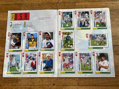 Άλμπουμ με αυτοκόλλητα. ποδοσφαιριστές. Εκδόσεις Upper Deck. ΗΠΑ 94. ΠΛΗΡΗΣ. 300 αυτοκόλλητα και σήματα. Οι εικόνες της συλλογής απεικονίζουν όλους τους παίκτες όλων των ομάδων που συμμετείχαν στην τελική φάση του παγκόσμιου πρωταθλήματος ποδοσφαίρου για τα έθνη. ένα τμήμα αφιερωμένο σε γήπεδα, χώρους αγώνων. Συμμετέχουσες χώρες: ΒΕΛΓΙΟ, ΒΟΥΛΓΑΡΙΑ, ΓΕΡΜΑΝΙΑ, ΕΛΛΑΔΑ, ΙΡΛΑΝΔΙΑ, ΙΤΑΛΙΑ, ΝΟΡΒΗΓΙΑ, ΟΛΛΑΝΔΙΑ, ΡΟΥΜΑΝΙΑ, ΡΩΣΙΑ, ΙΣΠΑΝΙΑ, ΣΟΥΗΔΙΑ, ΕΛΒΕΤΙΑ, ΑΡΓΕΝΤΙΝΗ, ΒΟΛΙΒΙΑ, ΒΡΑΖΙΛΙΑ, ΚΟΛΟΜΒΙΑ, ΜΗΧΑΝΙΑ, ΚΟΜΒΙΑ, ΚΑΜΑΝΙΑ ΣΑΟΥΔΙΚΗ ΑΡΑΒΙΑ ΝΟΤΙΑ ΚΟΡΕΑ. Με παίκτες που έγραψαν την ιστορία του παγκόσμιου ποδοσφαίρου: Berti Vogts, Bodo Illgner, Andreas Kopke, Manfred Binz, Guido Buchwald, Thomas Helmer, Jurgen Kholer, Michael Schulz, Stfean Effenburg, Thomas Hassler, Lothat Matthaus, Andreas Moller, Mathias Sammer, Christian Ziege, Jurgen Klinsmann, Bruno Labbadia, Karlheinz Riedle, O. Thon, Basile, Goycoechea, Altamirano, Jorge Borelli, Caceres, Oscar Ruggeri, Sergio Vazquez, Victor Gorosito, Diego Maradona, Carlos Redondo, L. Rodriguez, Diego Simone, Gustavo Zapata, Gabriel Batistuta, Julio Zaomra, Van Himst, Preud'homme, De Wilde, Albert, Borkelmans, Grun, Emmers, Dirk Medved, Vicenzo Scifo, Staelens,Vanderlets,Banderletnia,Ban der Heydenski, Degryse, Luc Nilis, Marc Wilmots, Parreira, Taffaril, Branco, Cafu, Ricardo Gomez, Jorginho, Roberto Carlos, Rocha, Santos, Dunga, Mauro Silva, Rai, Valber, Bebeto, Elivelton, Romario, Stoichkov, Penev,Cormadoba Ο Σαραβάκος, Μανωλάς, Dick Advocaat, Ed de Goeij, John de Woolf, Frank de Boer, Ronald Koeman, Ruud Gullit, Wim Jonk, Frank Rijkaard, Aron Winter, Rob Witschge, Jan Wouters, Dennis Bergkamp, Ronald de Boersman, Τζον, Marc Overmars, Bryan Roy, Marco van Basten, Jack Charlton, Patrick Bonner, Stephen Staunton, Paul McGrath, Roy Keane, Ray Houghton, John Sheridan, Andy Townsend, Ronnie Whelan, John Aldridge, Tony Cascarino, Sacchi, Pagliuca, Baresi, Costacur , Lanna, Maldini , Panucci, Albertini , Donadoni , Evani, Roberto Baggio , Casiraghi , Mancini , Signori , Gianluca Vialli , Hugo Sanchez , Garcia Aspe , George Finidi , A. Okocha , J. Flo , F. Raducio Ghaorgheiu , Popescu, Mostrovoi, Dobrovolski, Shalimov, Tomas Brolin, Stefan Schwarz, Andersson, Ravelli, Anders Limpar, Turkyilmaz, Chapuisat, Sforza, Pascolo, Bonvin, Sutter, Oman Biyik, Bell ... και πολλοί άλλοι ήταν το Παγκόσμιο Κύπελλο Fifa η δέκατη πέμπτη διοργάνωση του παγκόσμιου πρωταθλήματος ποδοσφαίρου για τις εθνικές ομάδες ανδρών που διοργανώνεται από τη FIFA κάθε τέσσερα χρόνια. Πραγματοποιήθηκε στις Ηνωμένες Πολιτείες της Αμερικής από τις 17 Ιουνίου έως τις 17 Ιουλίου 1994 και κέρδισε η Βραζιλία, αφού νίκησε την Ιταλία στον τελικό στα πέναλτι με 3-2. Για πρώτη φορά στην ιστορία ο παγκόσμιος τίτλος απονεμήθηκε μετά από πέναλτι, αφού ο κανονισμός και η παράταση του τελικού είχαν λήξει με ισοπαλία (0-0). . άλμπουμ φωτογραφημένο ολόκληρο, σελίδα σε σελίδα. το αντικείμενο προς πώληση είναι αυτό που φαίνεται στις φωτογραφίες. Το άλμπουμ είναι σε γενική κατάσταση, σύμφωνα με τις φωτογραφίες. JAP