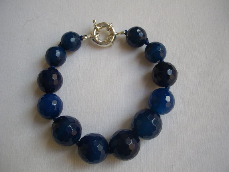 Bracciale in Agata blu. Sfere mm 12 sfaccettate ( 4 ) +  sfere mm14 sfaccettate ( 4 ) + sfere mm 16 sfaccettate ( 4 ) + chiusura rotonda in metallo anallergico diametro mm 15 + nodi ( 11 ).