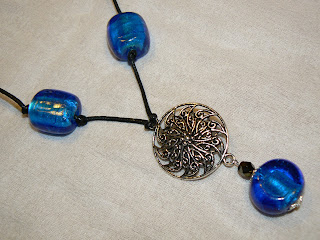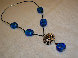 Collana con perle in vetro con foglia argenta all'interno,di circa 2 cm, con ciondolo finale, lunghezza collana 54