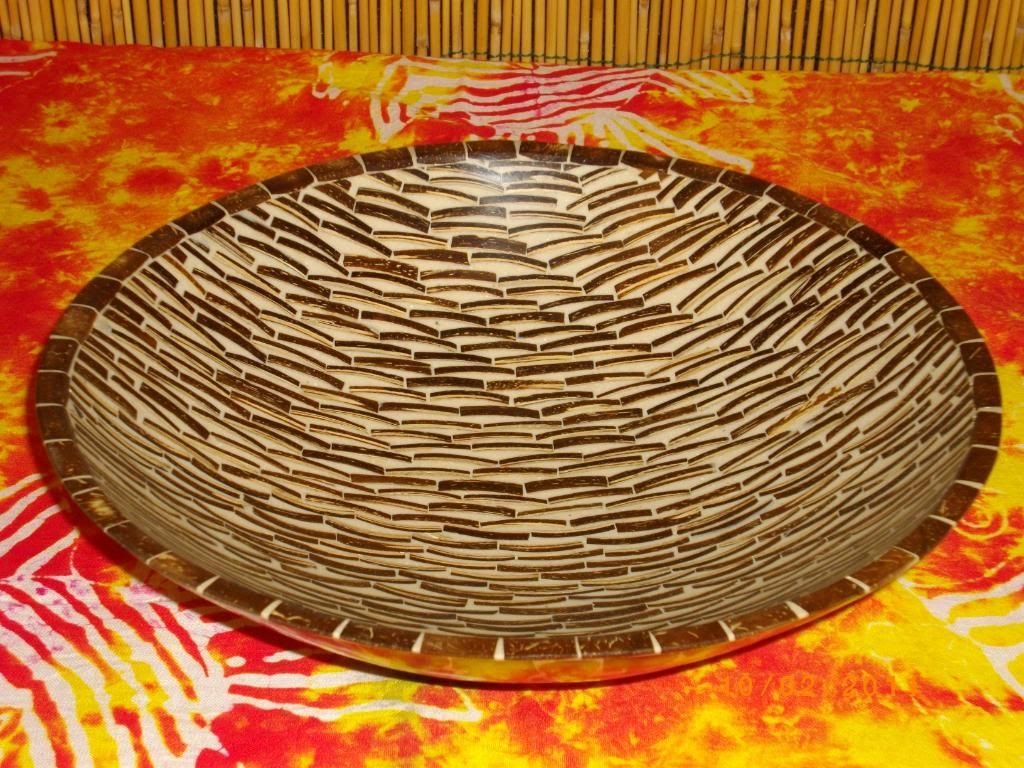 Ciotola con pezzetti di legno di cocco assemblati con resina bianca.Articolo fatto a mano da abili artigiani Balinesi. Peso : gr 697 circa Dimensione : h cm 8 diametro cm 30 circa Provenienza : Indonesia Bali Codice : don14c3