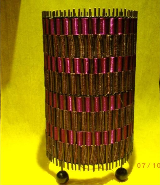 Lampada abat-jour cilindrica in tessuto lurex e bastoncini di legno su struttura in metallo con attacco per portalampada E14. Peso : gr 194 circa Dimensione : h cm 24x13 circa Provenienza : Indonesia Bali Codice : Ken2-2
