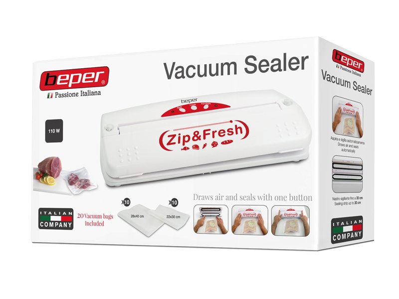 La macchina sottovuoto Beper ha 2 funzioni: aspira l'aria del sacchetto e sigilla automaticamente dopo la formazione del vuoto o sigilla il sacchetto senza effettuare il sottovuoto. Include nastro sigillante per sacchetto, 10 sacchetti: 5 pezzi da 28x40 cm e 5 pezzi da 22x30 cm. E' ideale per vari tipi di alimenti e permette di conservare i cibi a lungo. Isola perfettamente qualsiasi prodotto dall'atmosfera circostante, bloccandone l'emissione di odori. CARATTERISTICHE TECNICHE: Corpo in abs 2 funzioni: Aspira l´aria del sacchetto e sigilla automaticamente dopo la formazione del vuoto Sigilla il sacchetto senza effettuare il sottovuoto Nastro sigillante per sacchetto fino a 30 cm 2 spie di funzionamento Include 20 sacchetti: 10 pezzi 28 x 40 cm, 10 pezzi 22 x 30 cm Ideale per vari tipi di alimenti Permette di conservare i cibi a lungo Potenza 110 Watt Alimentazione 230V ~ 50Hz