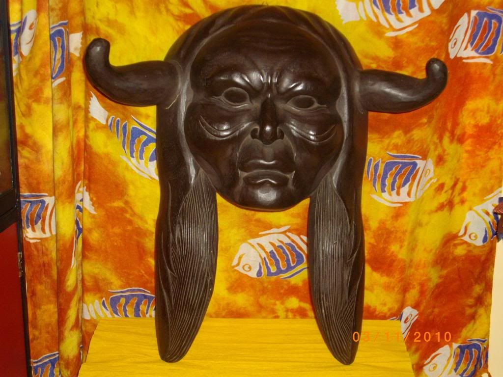 Maschera di capo indiano con corna e lunghi capelli in legno Albesia decorato anticato. Peso: gr circa Dimensione : h cm circa Provenienza : Indonesia Bali  Codice : sub1-a |  |  |  |  |