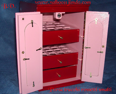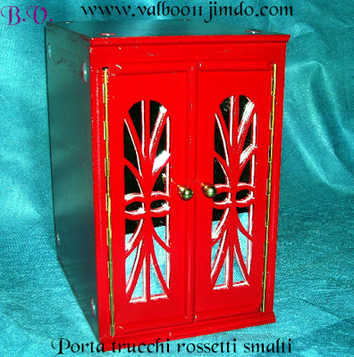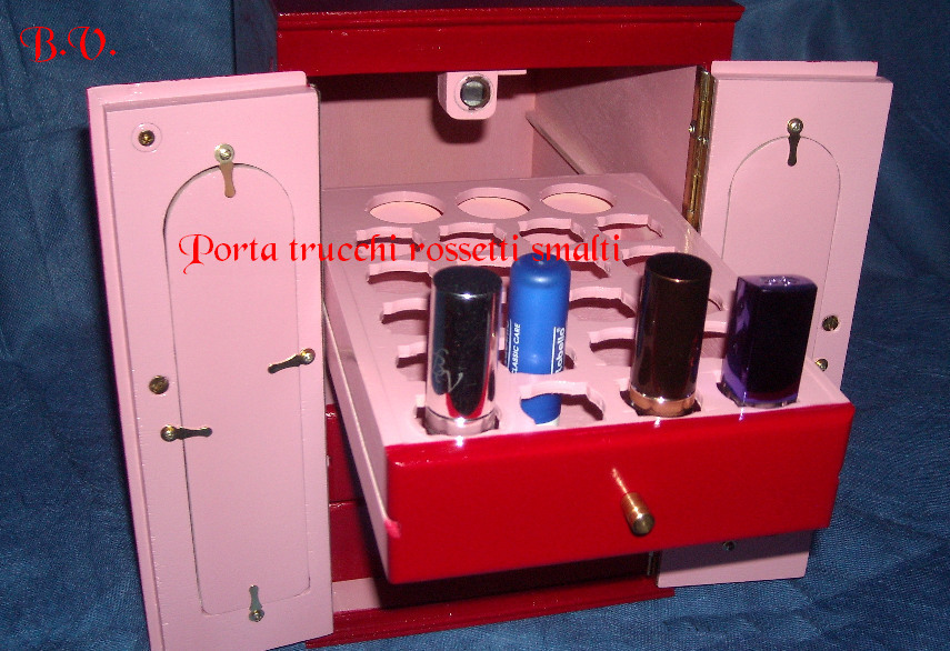 I vostri rossetti, smalti, lucidalabra, sono sempre sparsi per tutta la casa? Ecco quello che fà per voi.Utile ed elegante porta rossetti componibile. Costruita interamente a mano con legno di pioppo spessore 1cm, e verniciata con vernici ecologiche. Ha3cassetti dove si può riporre il necessario per il trucco, e per il viso in generale. Si può avere nel colore desiderato ( da decidere dopo l' aquisto). Se acquistate più moduli e amate tutti i colori, si può verniciare ogni modulo in un colore diverso.