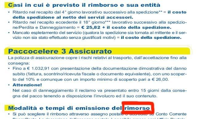 Comunque visto che il danno è fatto, comincia a fare reclamo o presso l'ufficio postale o direttamente via internet. Nel sito delle poste c'è una sezione per i reclami. Nel reclamo a parte dire che il loro servizio è pessimo, indica il valore del pacco e faglielo pesare. Scrivi che chiedi il rimborso. Fatti una copia ed invialo. Passerà un po' di tempo però riceverai il rimborso. Per fare prima puoi chiamare l'assistenza telefonicamente e dire che hai trasmesso un reclamo con richiesta di rimborso e che non hai ancora ricevuto risposta.